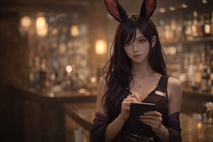 アニメグッズに埋もれた部屋で呆然とする女性と、魔導書を持って静かに降り立つ魔王(黒髪・うさ耳・写実的で美しい中性的ビジュアル)/紙片が舞い、祝祭の光が揺れる幻想構図